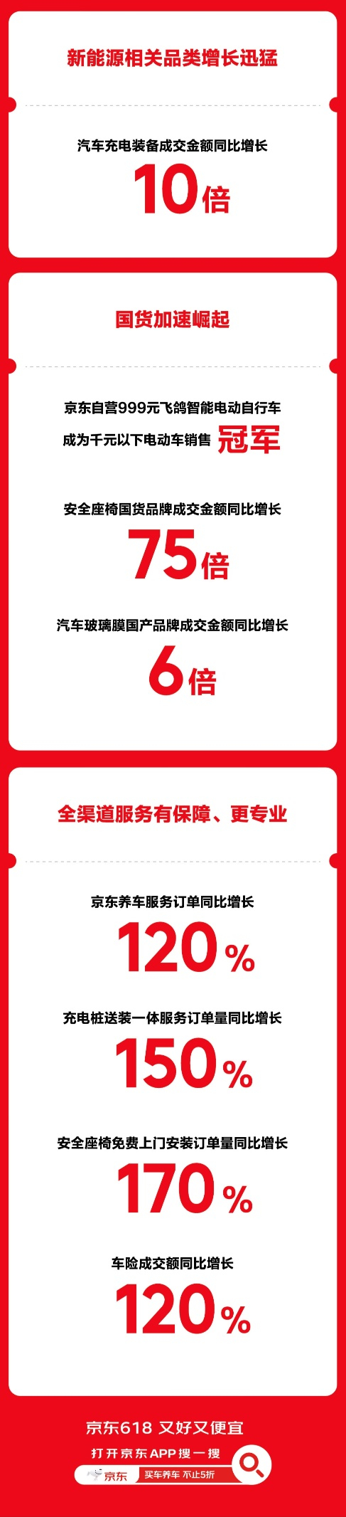 随着用户服务需求持续升级,京东汽车全渠道服务迎来显著增长。京东养车服务订单量同比增长120%,专业维保服务获得用户认可。充电桩“送装一体”服务订单量同比增长150%,安全座椅免费上门安装服务订单量同比增长170%,彰显便捷安装服务已成用户关注的消费焦点。同时,车辆保护需求旺盛,隐形车衣成交金额同比增长185%,车险成交额同比增长120%。京东汽车以“有保障 更专业”的全渠道服务,助力用户综合保障体验稳步提升。