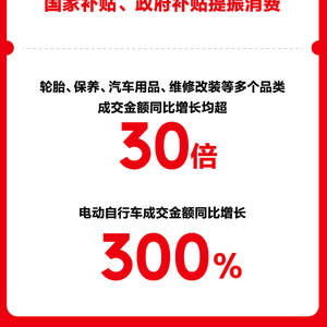 在国家补贴与京东汽车双重补贴的有力提振下,汽车后市场品类集体井喷。轮胎、保养、汽车用品、维修改装等核心后市场品类成交金额同比均呈现30倍以上惊人增长,彰显了政策刺激下消费者对车辆维护与升级的强劲需求。同时,电动自行车以旧换新享国家补贴至高立省75%,带动成交金额同比增长300%。