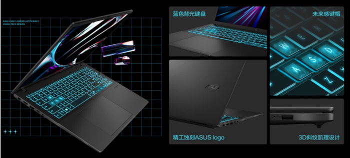 华硕无畏Pro16 2025哑光黑机身采用丝滑触感材质,有效减少指纹残留。A面精工蚀刻ASUS Logo,搭配蓝色背光键盘和未来感十足的键帽,尽显硬核科技美学,超酷感十足。
