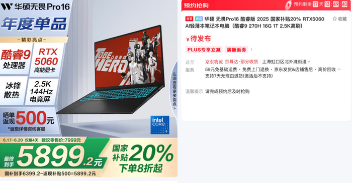5月30日,华硕无畏系列全新成员——华硕无畏Pro16 2025正式亮相,并在京东同步开启预售,全新标压酷睿9、RTX5060独立显卡、144Hz高刷全能好屏硬核赋能,带来更出色的创作、游戏和办公体验,无畏挑战尽享无限精彩。新机今日上线预约,首发价格7999元,叠加国补和返现优惠后最终到手价5899.2元起,6月16日将正式发售。