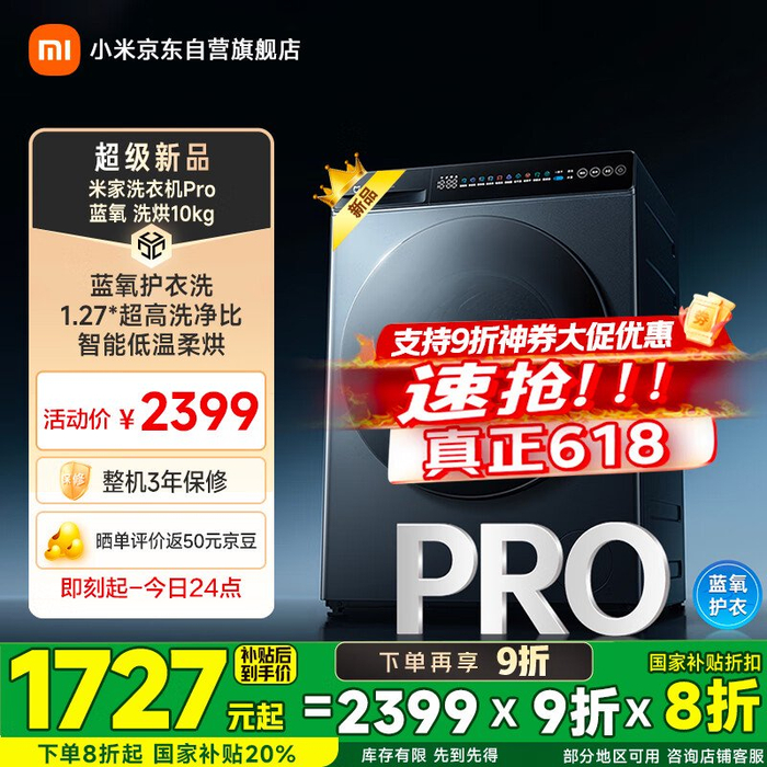 IT之家 5 月 31 日消息,小米米家洗衣机 Pro 蓝氧洗烘 10kg 现已在京东平台开售,售价 2399 元,叠加 9 折优惠券、8 折国补,到手价 1727 元起。