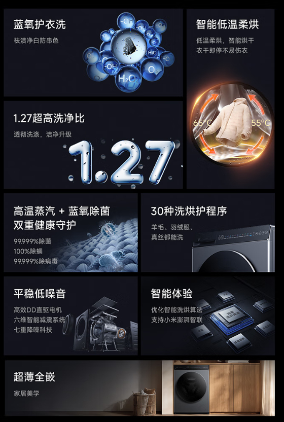 据介绍,这款产品支持蓝氧护衣洗,可有效去除 6 大类、35 种常见污渍;达到超高洗净比 1.27,远超国家标准 1.03;支持 30 种洗烘护程序,针对羊毛衫、羽绒服、真丝、冲锋衣、运动服不同衣物材质,定制专业洗护程序。