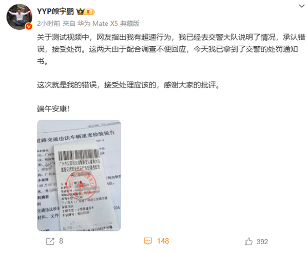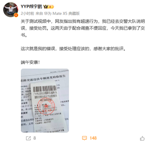 今日,颜宇鹏发文称,关于测试视频中网友指出超速行为,已经去交警大队说明了情况,承认错误,接受处罚,这两天由于配合调查不便回应,今天已拿到了交警的处罚通知书。