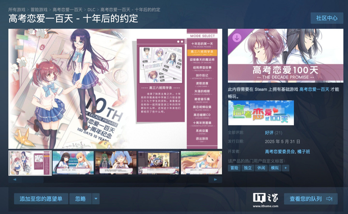 IT之家 5 月 31 日消息,《高考恋爱一百天》是一款受好评的国产文字冒险游戏,于 2015 年 5 月 31 日发售,而在 10 年后的今天,这款游戏推出《高考恋爱一百天 - 十年后的约定》DLC,讲述了“10 年后的故事”。