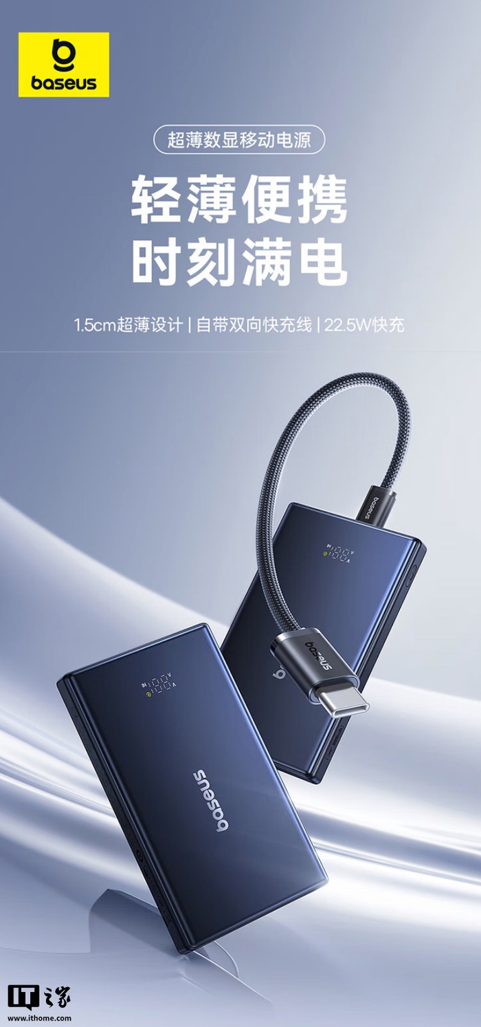 IT之家 5 月 31 日消息,倍思现已在京东上架一款超薄数显移动电源,这款移动电源主打 1.5cm 厚度,使用 2C+1A 设计,自带一根 USB-C 短线,定价为 107 元。