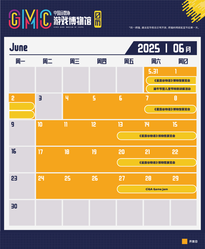 以上6月展览、活动时间可见下图活动日历,更多信息,请关注“中国音数协游戏博物馆”微信公众号与“游戏博物馆GMC”小程序,以最新通知为准。