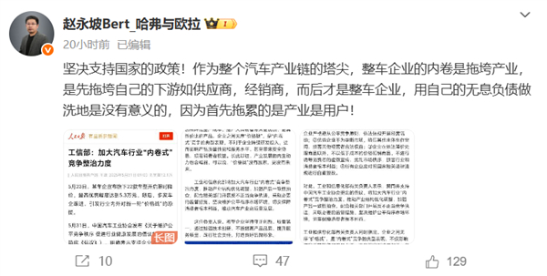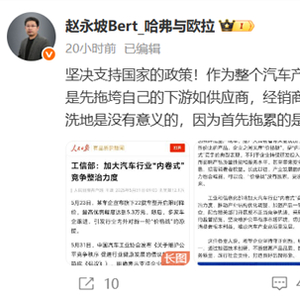 赵永坡还强调,作为整个汽车产业链的塔尖,整车企业的内卷是拖垮产业,是先拖垮自己的下游如供应商,经销商,而后才是整车企业,用自己的无息负债做洗地是没有意义的,因为首先拖累的是产业是用户。