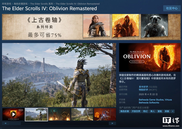 IT之家 6 月 1 日消息,微软 Bethesda 开放世界奇幻角色扮演游戏《上古卷轴 4:湮没》重制版现已在 Stean 平台迎来新史低折扣优惠,游戏原价 249 元,现 8 折后到手价 199.2 元,优惠将于 6 月 6 日结束。