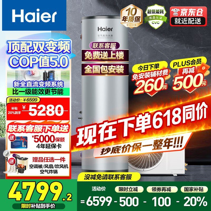 海尔200升空气能热水器大促,多重优惠到手价4399元