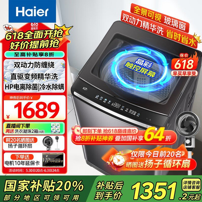 海尔云溪XQS100-BE6288直驱变频洗衣机1351元特惠
