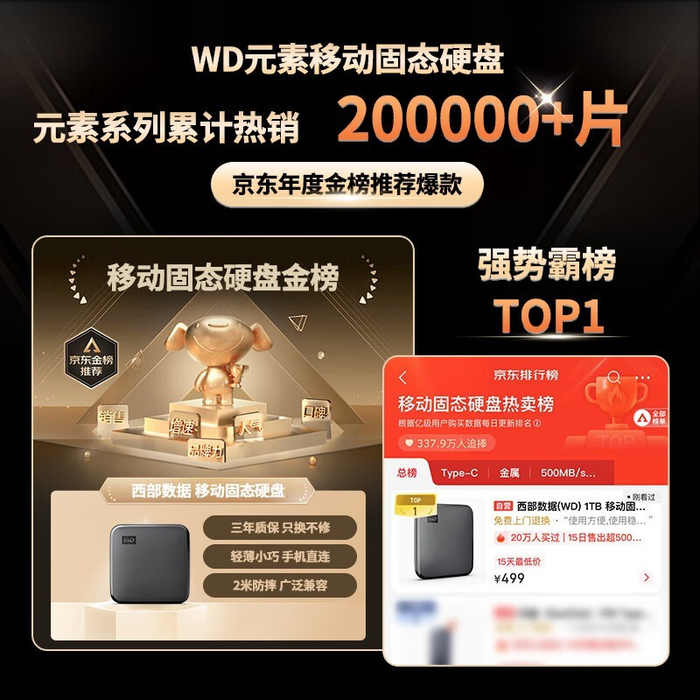 西部数据1TB移动固态硬盘促销价399元
