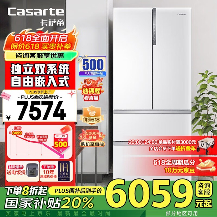 卡萨帝纯白冰箱555L大容量双变频节能高效杀菌保鲜