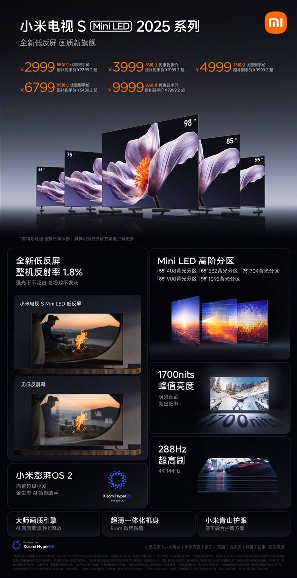 小米电视S Mini LED 2025系列98英寸版开售:国补价7999.2元