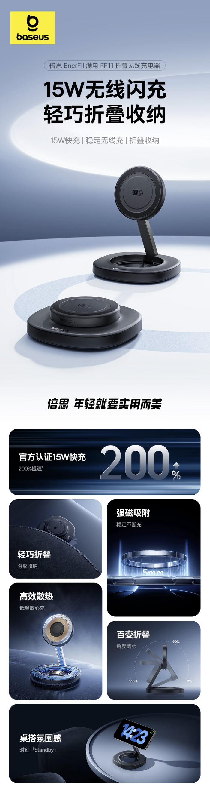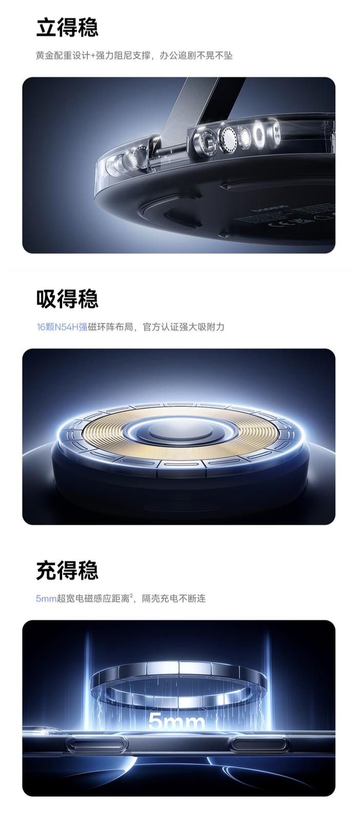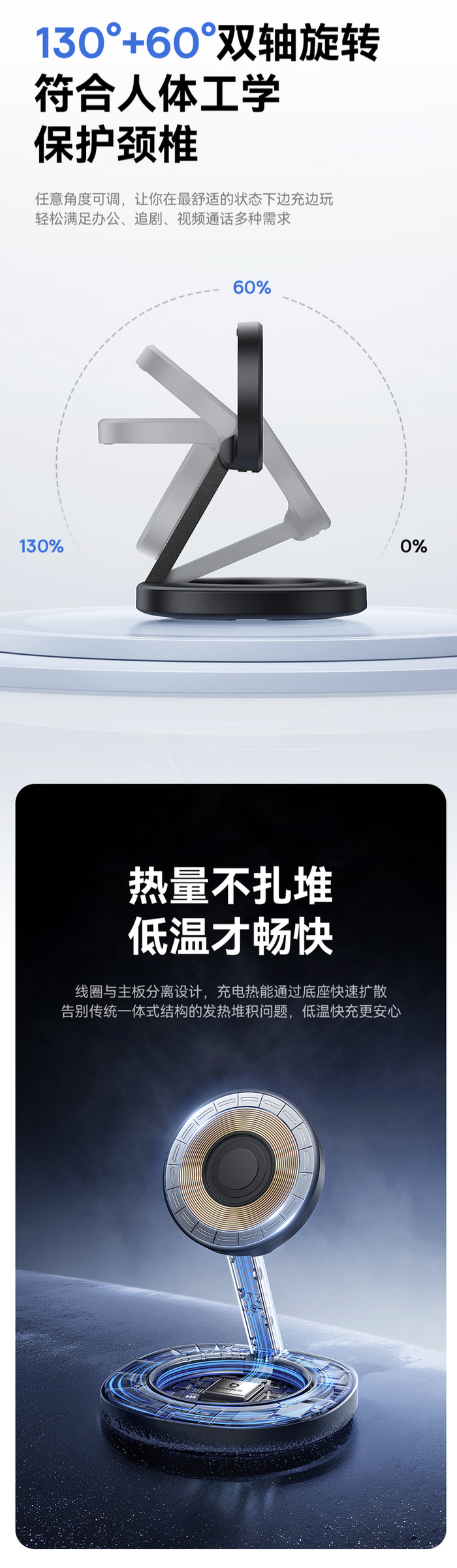 据介绍,这款充电器提供 16 颗 N54H 强磁环阵布局,拥有 5mm 电磁感应距离,支持 130 度 + 60 度旋转,充电器配备防滑硅胶底座和 PC 防火材质外壳。