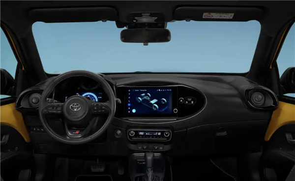 内饰部分,新款Aygo X配备了全新的全液晶仪表盘和三辐式多功能方向盘,中控多媒体显示屏尺寸增大,中控台装饰设计优化,更加简洁干练。