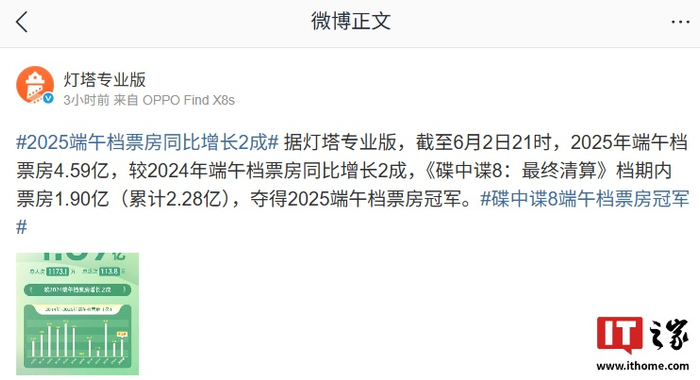 IT之家 6 月 2 日消息,据灯塔专业版,截至 6 月 2 日 21 时,2025 年端午档票房 4.59 亿,较 2024 年端午档票房同比增长 2 成,《碟中谍 8:最终清算》档期内票房 1.90 亿(累计 2.28 亿),夺得 2025 端午档票房冠军。