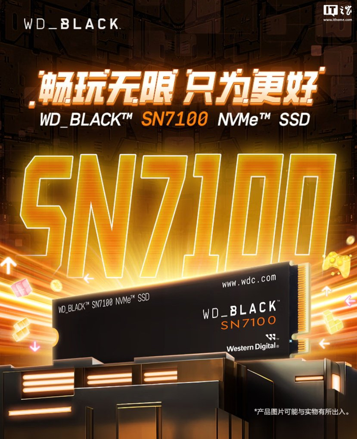 西部数据表示 WD_BLACK SN7100 面向主流游戏玩家。该 SSD 采用了 DRAMless HMB 方案,搭载 3D TLC NAND 闪存,能满足容量日渐增长的现代游戏的存储需求,同时较上一代产品 SN770 能效提高了 100%。