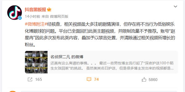 博主挑战“深夜护送陌生女孩回家”被抖音禁言 网友:处罚太轻!应该封号