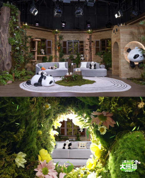 值得一提的是,节目以科技匠心,特别构建4K超高清大熊猫生态数字影棚,逼真模拟川西生态,将熊猫家园搬进演播室。秉持生态理念,演播厅变身为一座松弛温馨的熊猫树屋:生生不息的守护“神树”、葱郁竹林与灵动熊猫元素交织,营造扑面而来的自然野趣。在这里,嘉宾与观众得以零距离贴近大熊猫的生活环境,亲身感受那份山林间的萌动生机。