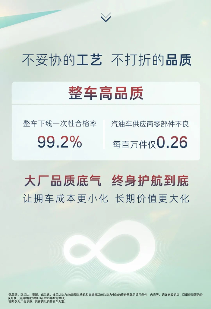 IT之家从官方介绍获悉,该权益的获取截止时间为 2025 年 12 月 31 日,包含价值 8000 元的发动机、变速箱、混动动力电池三大终身质保权益。