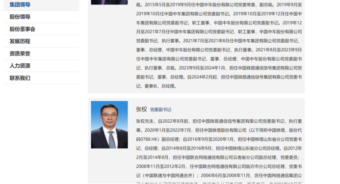 6月3日,在中国通号集团的官网上,无论是集团领导还是股份公司领导的名录里,张权都非常醒目地挂在第二位,因为中国通号集团目前新任总经理还未到位。
