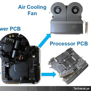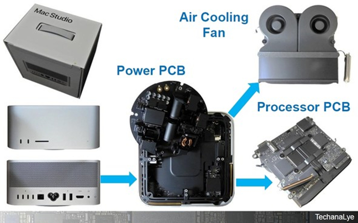 内部的RE-Timer芯片也是苹果制造的。如右图所示,将机箱底部的盖子取下,里面是电源板,下面是处理器板、冷却风扇和散热器。
