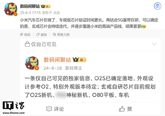 IT之家 6 月 3 日消息,博主 @数码闲聊站 今日发文透露了小米芯片相关进展信息:“小米汽车芯片在做了,车规级芯片验证时间更长。再结合 5G 基带在研,可以确定的是,玄戒芯片会持续迭代,并逐步覆盖小米的高端产品线,硕果累累。”