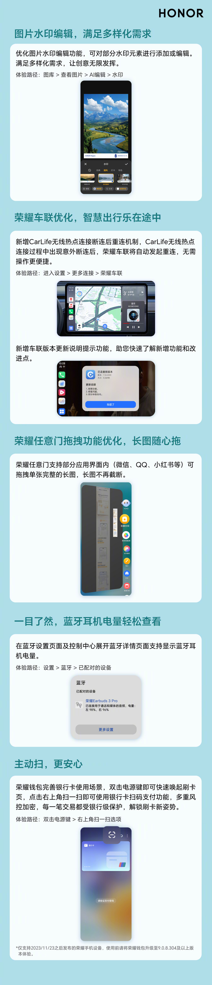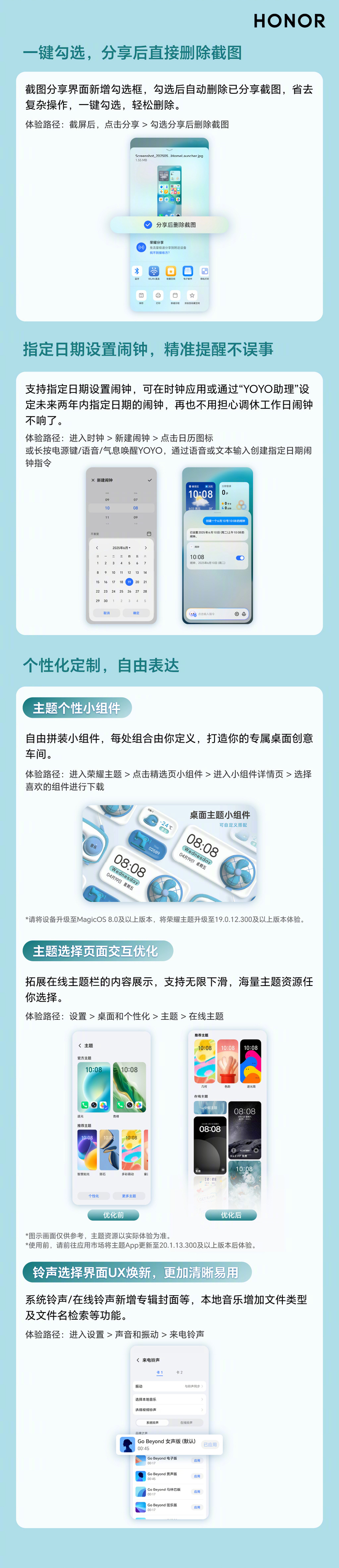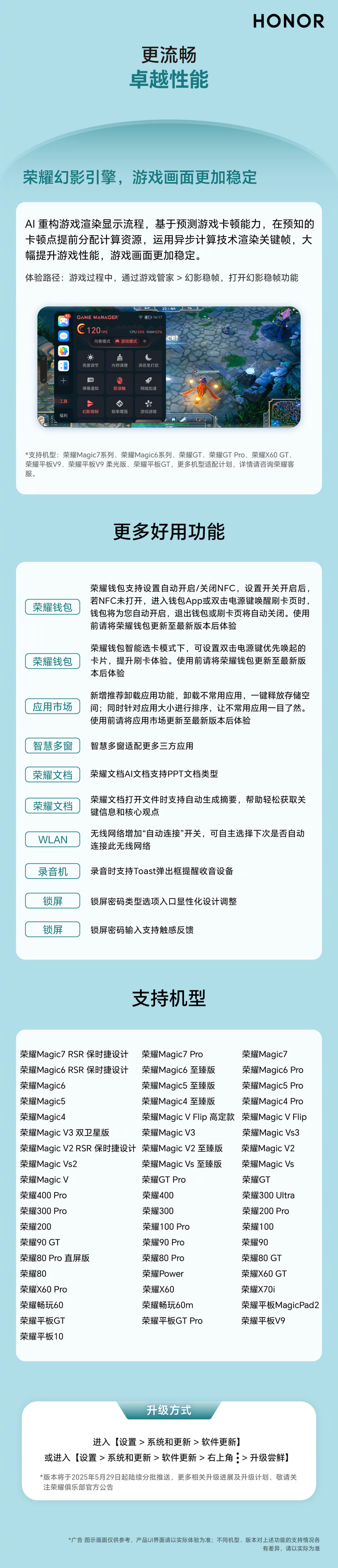 荣耀手机 2025 年体验升级第五波新版本已于 2025 年 5 月 29 日起陆续分批推送,适配 Magic7 /6 /5 /4 系列、GT 系列、数字 80 / 90 / 100 / 200 / 400 系列等超 50 款机型。IT之家附更新内容如下:
