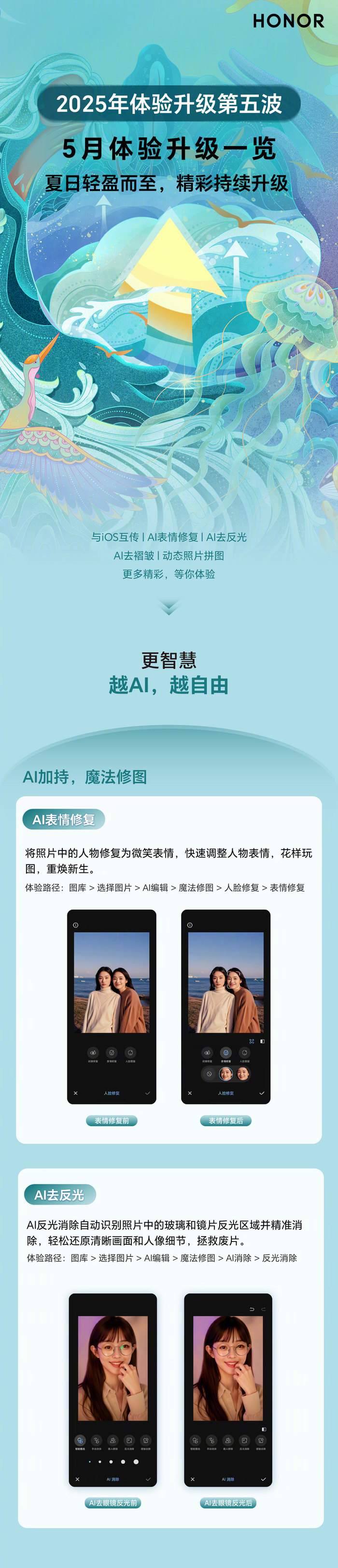 荣耀手机 2025 年体验升级第五波开启推送:新增 iOS 互传、AI 表情修复等功能