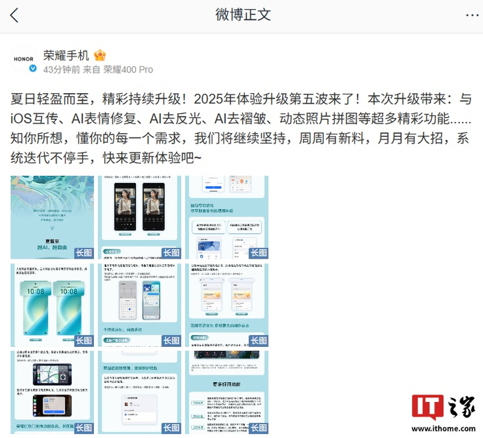 IT之家 6 月 3 日消息,荣耀手机官方今日宣布为旗下机型推出 2025 年第五波体验升级。据介绍,本次升级带来了与 iOS 互传、AI 表情修复、AI 去反光、AI 去褶皱、动态照片拼图等功能。