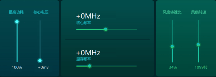 性能板块涵盖了显卡超频和风扇转速这两大核心调节选项。其中显卡超频包含功耗、核心电压、核心频率、显存频率的多项调节。风扇则是可以调整转速比和转速。