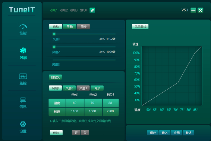 玩家可以分别调节单一风扇的转速,也可以自行设置多段温度墙。即显卡上升至标定温度即可自动解锁相应的转速。
