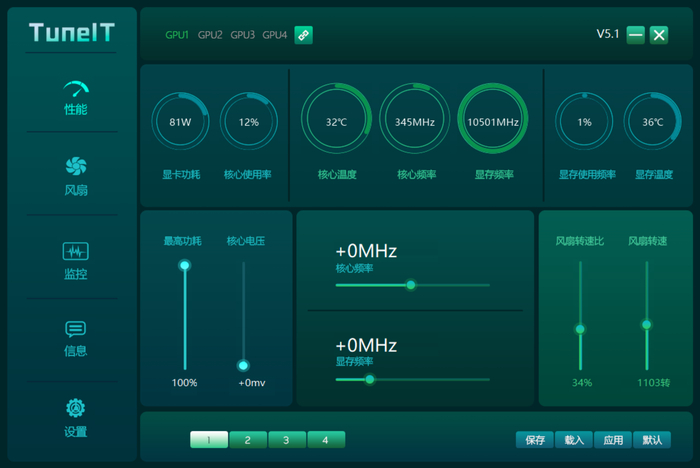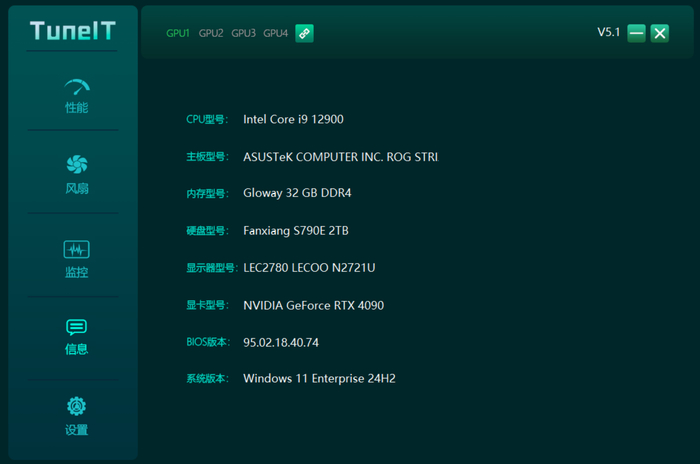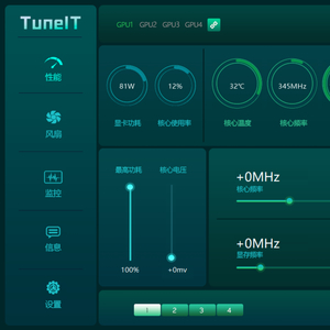 映众TuneIT以深邃墨绿色为主调的界面设计。划分性能、风扇、监控、信息、设置五大核心模块,每个板块均采用卡片式布局与动态可视化图表,让新手用户无需复杂学习即可直观掌握关键参数。
