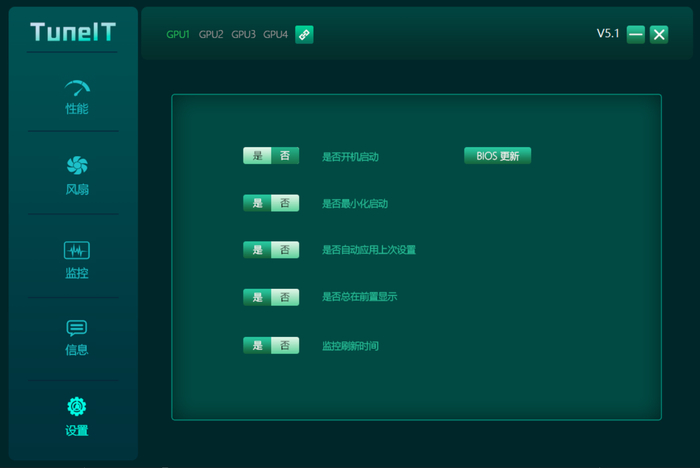 设置板块主要时对软件的内部控制及系统层面的细微设置。我们也把BIOS更新放在了这一分类中。映众50系列显卡BIOS有需要可以找公众号客服。