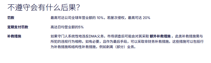 从DMA官网来看,如果苹果未能在期限内达到欧盟要求,就需要定期缴纳罚款,罚款上限最高可达公司全年营业额的20%。