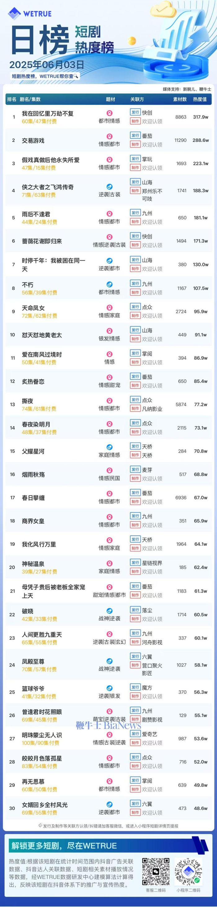 1、本日榜为WETRUE短剧数据公司提供,新腕儿和鞭牛士提供联合支持。