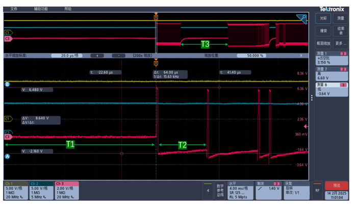 如以下半桥demo板实测波形所示,在启机阶段(图中T1)由于电容Cc还没有充电,负压无法建立,所以此时是零压关断;在驱动芯片发波后的负压关断期间(图中T2),负压幅值随电容放电波动;在长时间关断时(图中T3),电容负压无法维持,逐渐放电到零伏。因此,阻容分压电路往往用于对可靠性要求相对较低的中小功率电源应用,对于大功率电源系统并不适用。