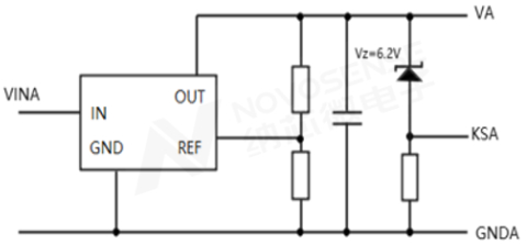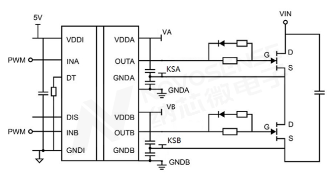 直驱式驱动方案首先需要选取合适欠压点的驱动芯片,如NSI6602VD,专为驱动E-mode GaN设计了4V UVLO阈值,再配合外部正负电源稳压电路,就可以直接驱动E-mode GaN,以下为典型应用电路: