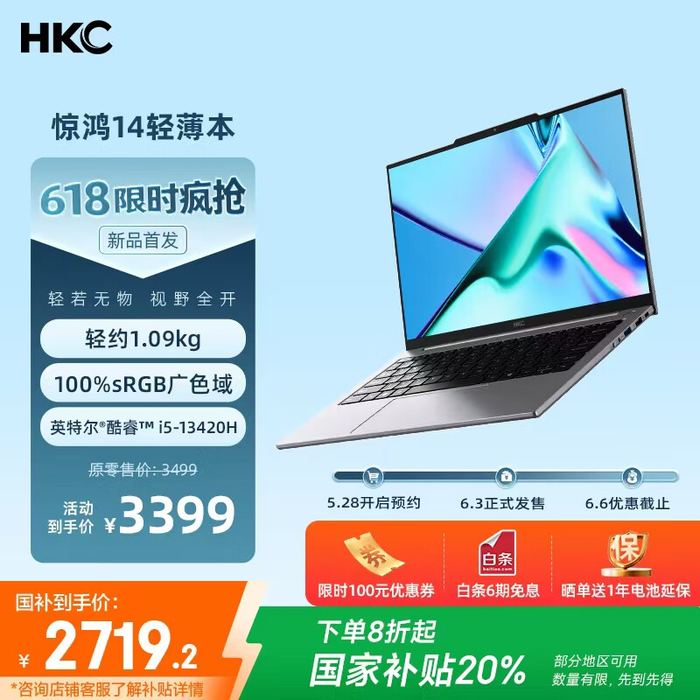1.09kg 轻薄本:HKC 惊鸿 14 新增 i5-13420H 版本,3399 元起可享国补