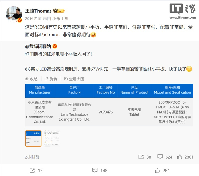 王腾官宣小米 REDMI 首款旗舰小平板:手感好、性能强、配置满,全面对标 iPad mini