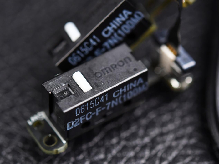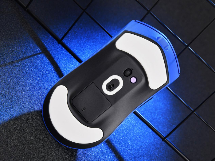 底面模具并不是平整一片,将传感器周围以外的部分弧形抬高而避免和鼠标垫发生摩擦。脚垫包括前后两块大面积脚垫+传感器环形脚垫,质感略硬,冰爽顺滑。电源开关、紫色的个性化按键以及磁吸接收器收纳仓分布整齐,可以看出布局经过了精心排列。