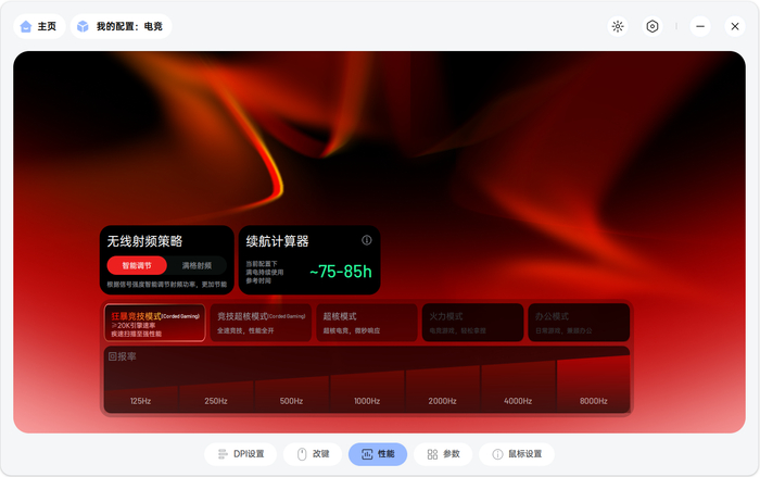 笔者采用的设置是全部性能拉满,8KHz无线回报率+狂暴竞技模式,DPI则采用高DPI低系统鼠标速度的策略,全部设置在【电竞】配置模式下,当打开《三角洲行动》等竞技游戏后,自动进行切换。