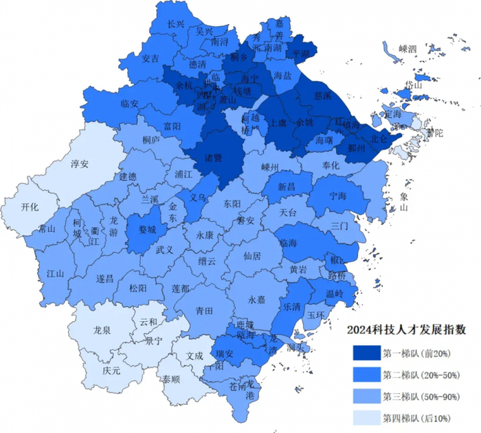 最新发布的《2024浙江科技人才发展指数》清晰地展现出全省科技人才发展格局,呈现3级梯队分布。杭州、宁波、嘉兴科技人才发展指数处于第一梯队,杭州更是以97.62居榜首,优势显著,加快人才集聚和项目落地。温州、绍兴、湖州、金华和台州位于第二梯队,衢州、丽水和舟山处于第三梯队。