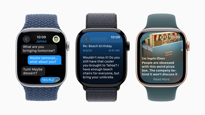 新的 S10 SiP 芯片也成功“瘦身”,带来出色的性能、能效和智能功能。S10 SiP 芯片与内置的 4 核神经网络引擎驱动了用户日常所需的智能功能,包括双指互点两下手势、设备端 Siri、听写和自动体能训练检测;多项重要安全功能,如车祸检测和摔倒检测;此外还有 watchOS 11 中更新的智能叠放功能、重新设计的照片表盘及翻译 App。