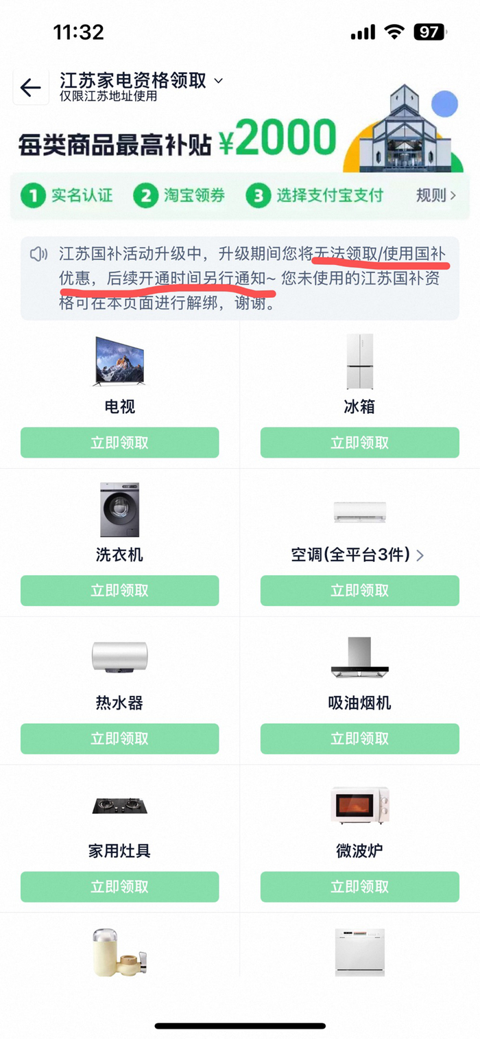 今天笔者在淘宝的江苏国补资格领取页面也发现,无法领取家电和手机数码的补贴。页面提示:“江苏国补活动升级中,升级期间您将无法领取/使用国补优惠,后续开通时间另行通知”