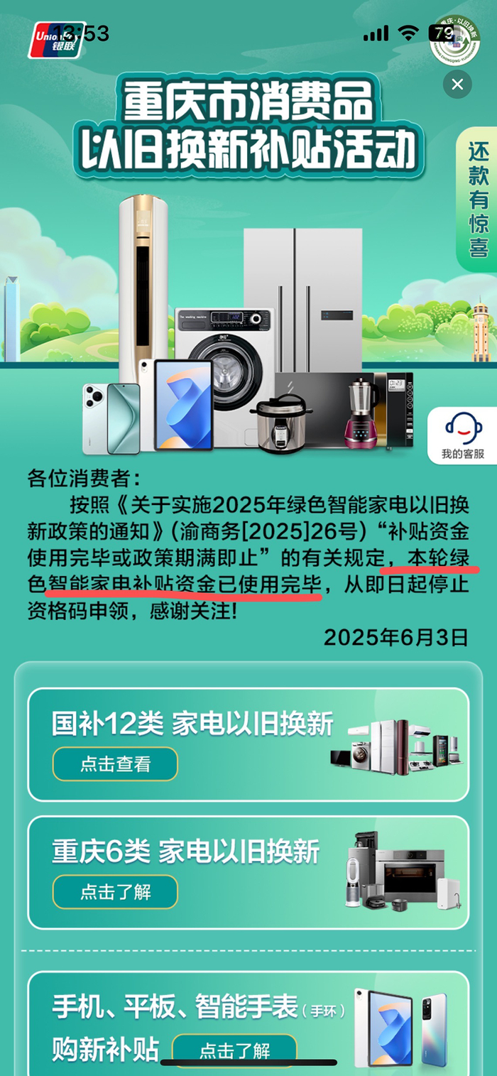 6月3日,云闪付中重庆家电国补页面显示:按照《关于实施2025年绿色智能家电以旧换新政策的通知》(渝商务[2025]26号)“补贴资金使用完毕或政策期满即止”的有关规定,本轮绿色智能家电补贴资金已使用完毕,从即日起停止资格码申领。