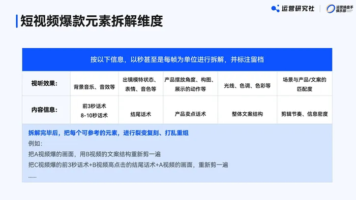 在内容信息上,还要拆解前三秒话术,第 8~10 秒话术,结尾话术,产品卖点话术,整体文案结构,剪辑节奏、信息密度等。