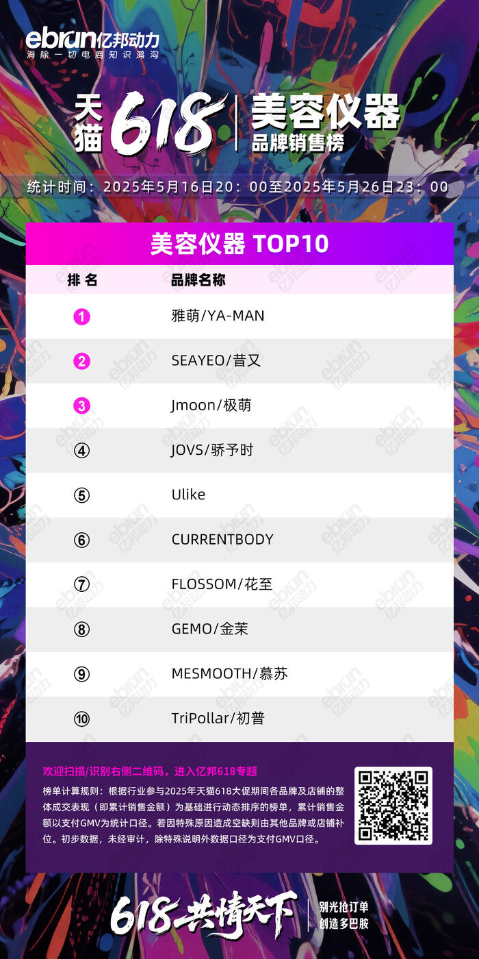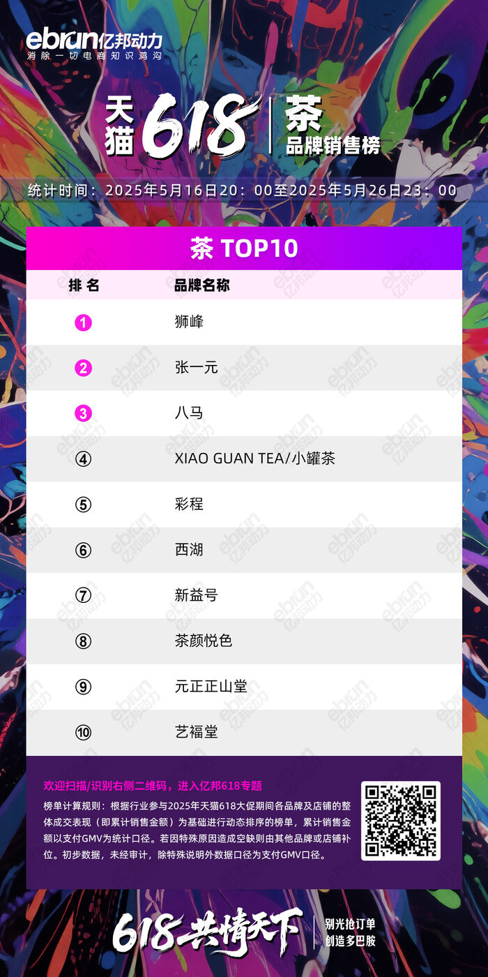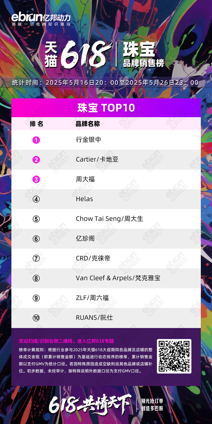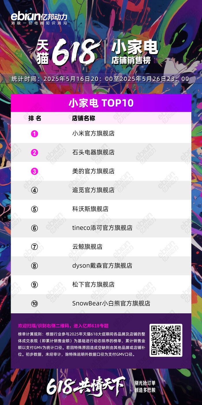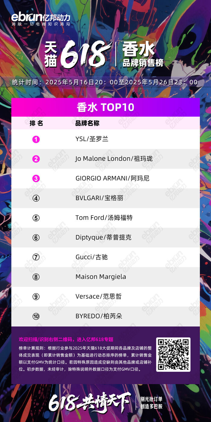 根据行业参与2025年天猫618大促期间各品牌及店铺的整体成交表现(即累计销售金额)为基础进行动态排序的榜单,累计销售金额以支付GMV为统计口径。若因特殊原因造成空缺则由其他品牌或店铺补位。初步数据,未经审计,除特殊说明外数据口径为支付GMV口径。