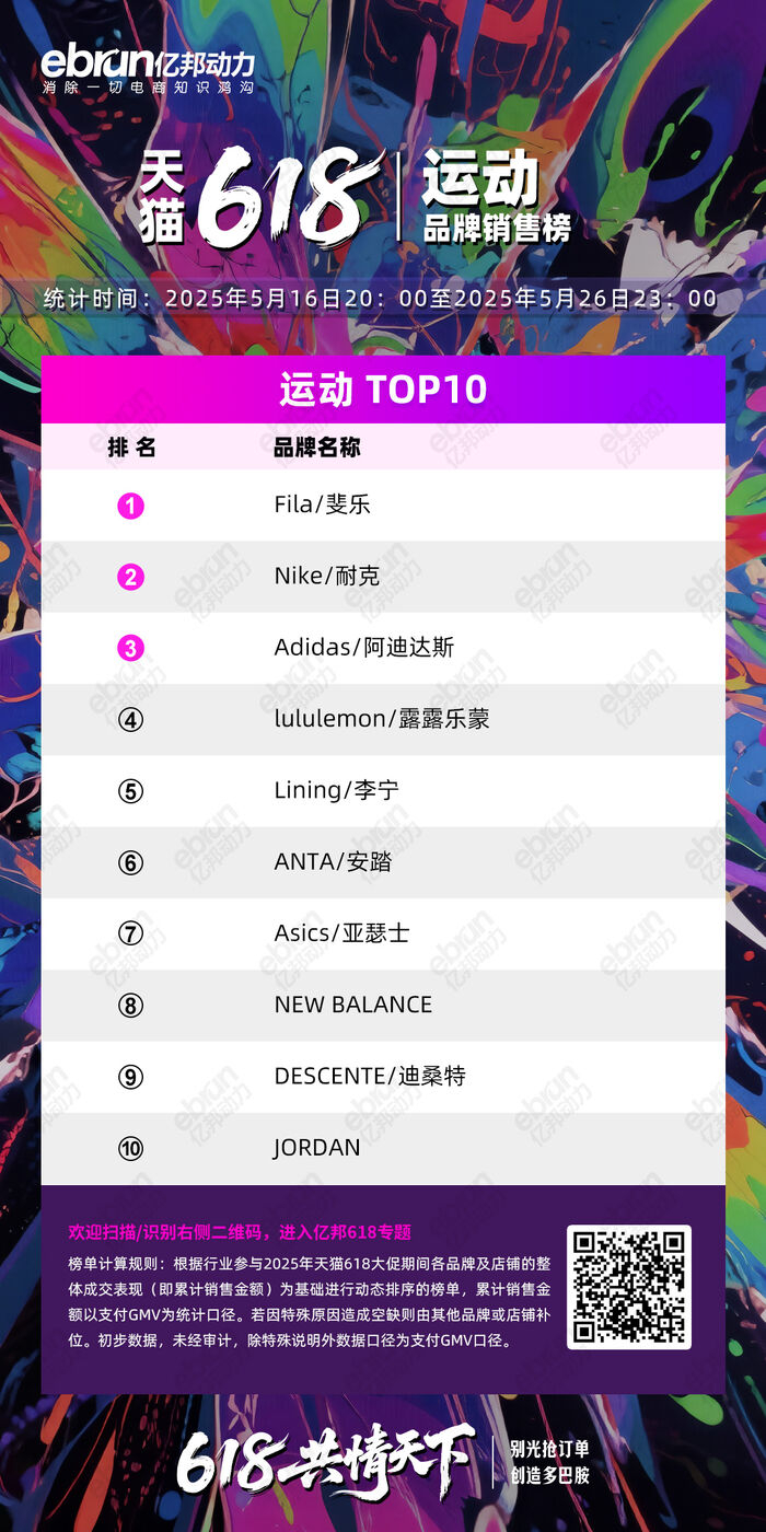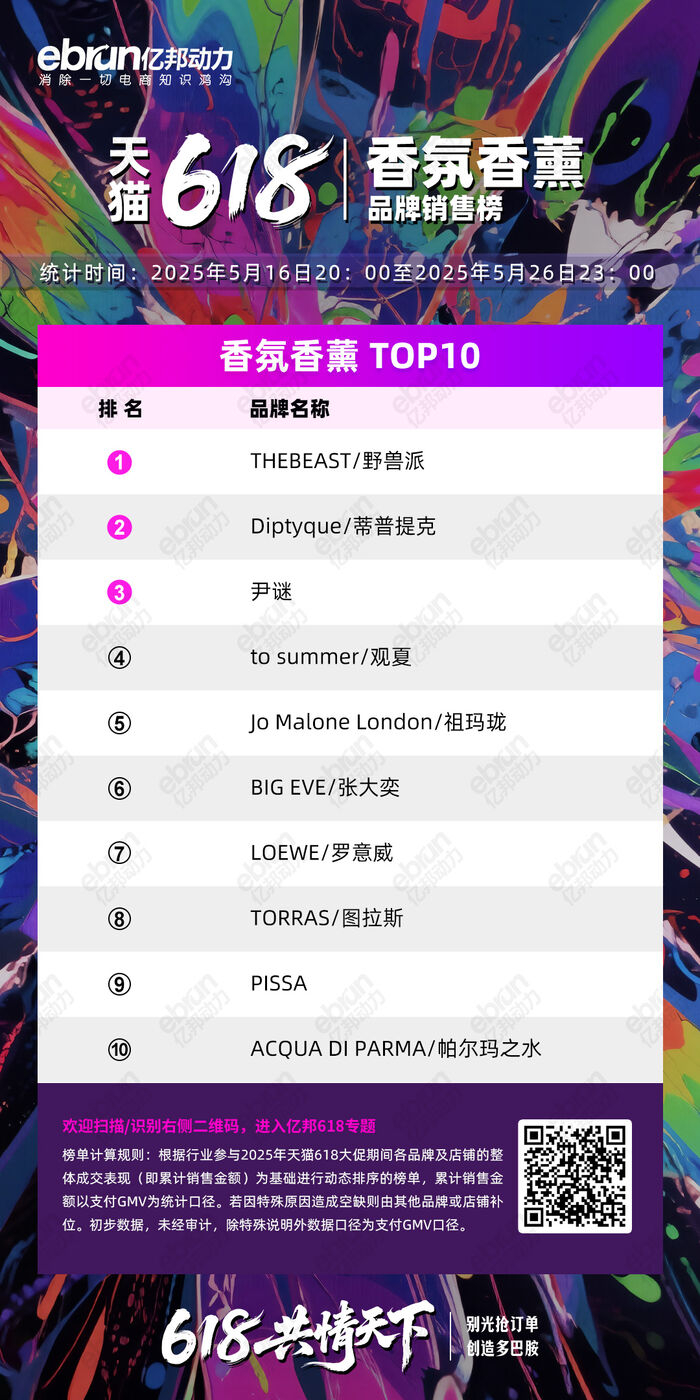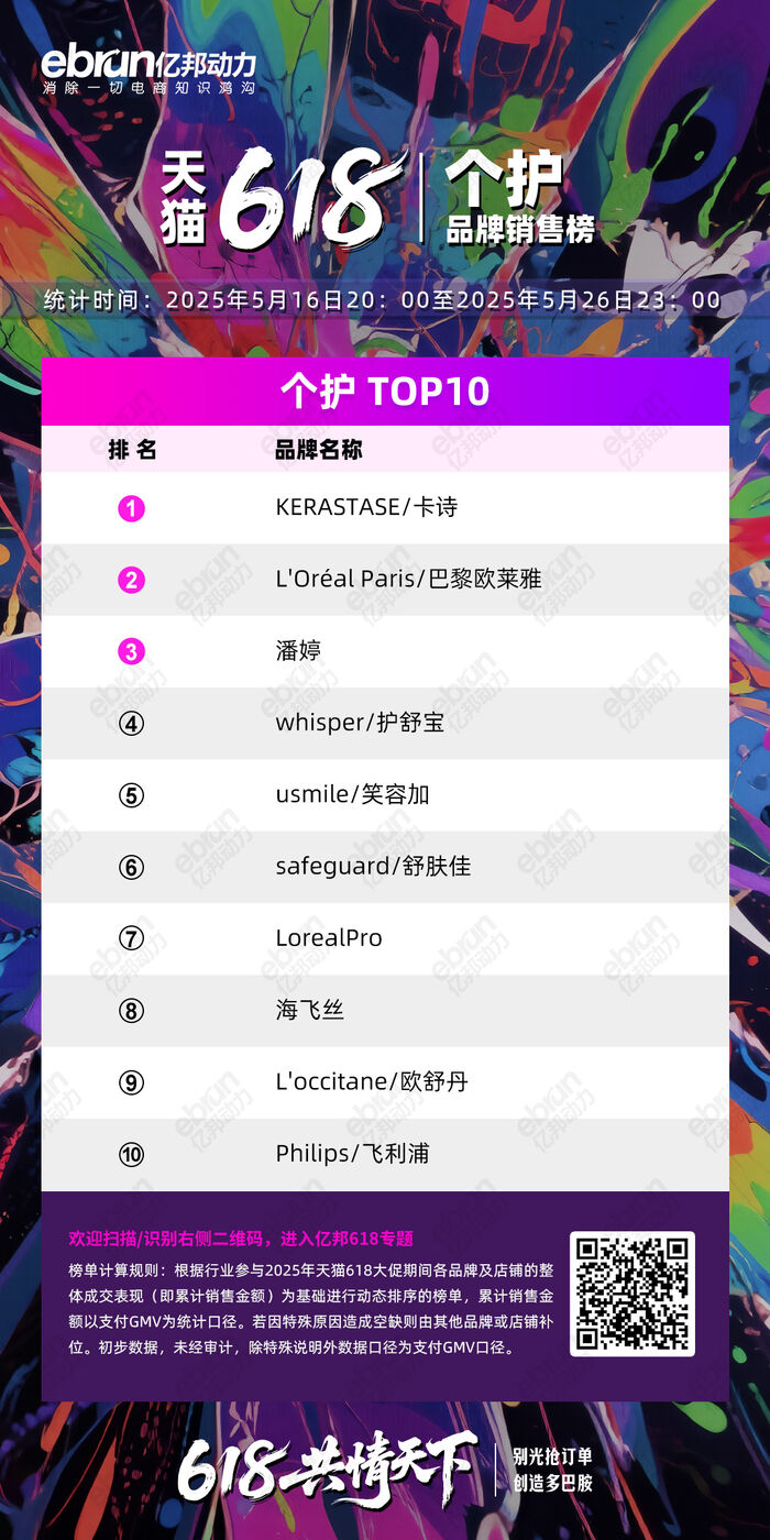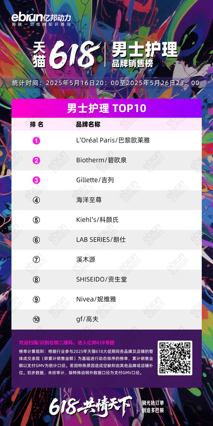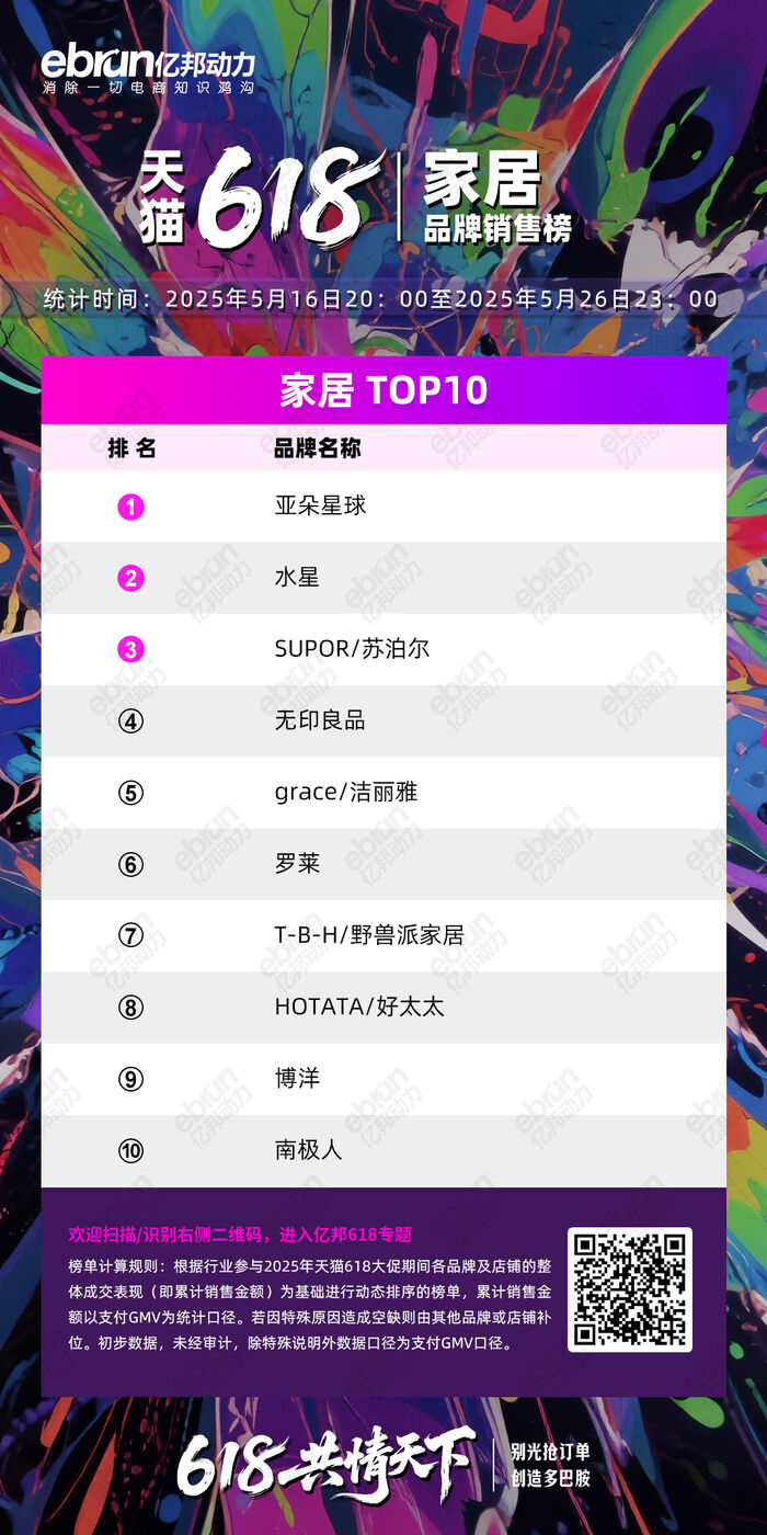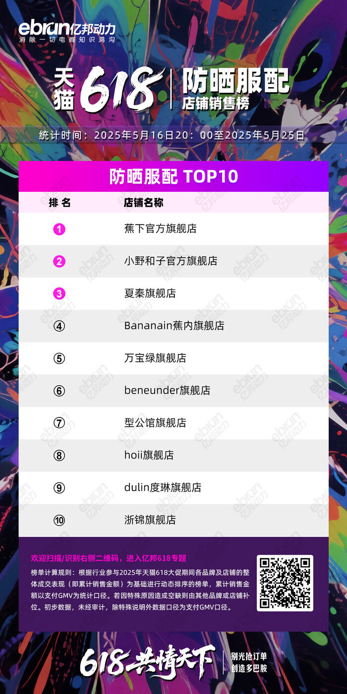 根据行业参与2025年天猫618大促期间各品牌及店铺的整体成交表现(即累计销售金额)为基础进行动态排序的榜单,累计销售金额以支付GMV为统计口径。若因特殊原因造成空缺则由其他品牌或店铺补位。初步数据,未经审计,除特殊说明外数据口径为支付GMV口径。