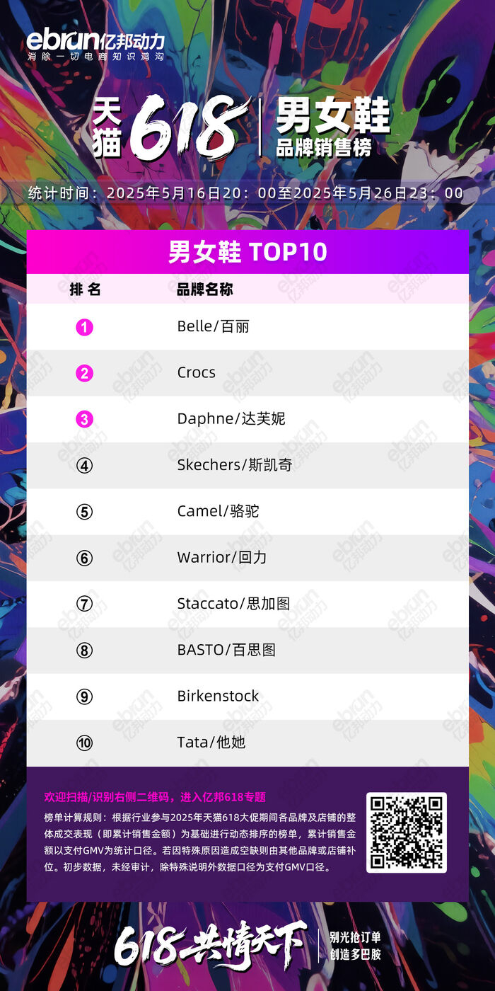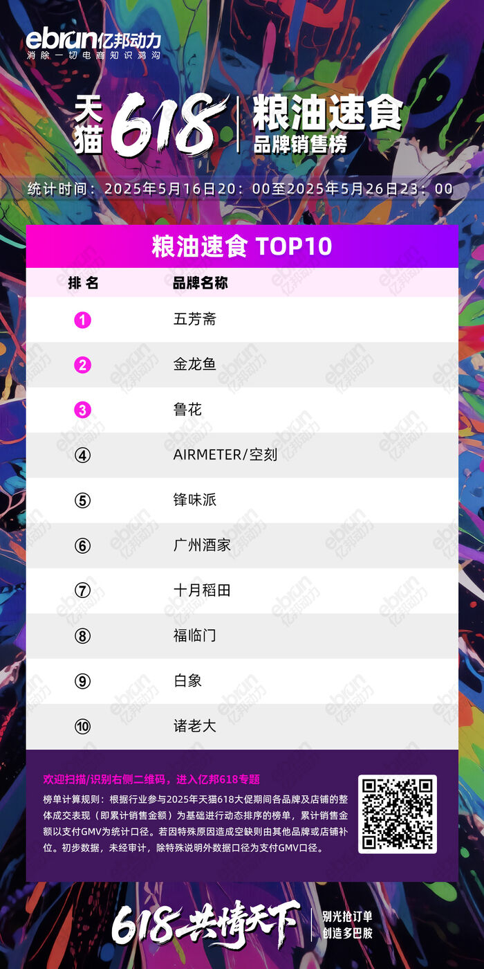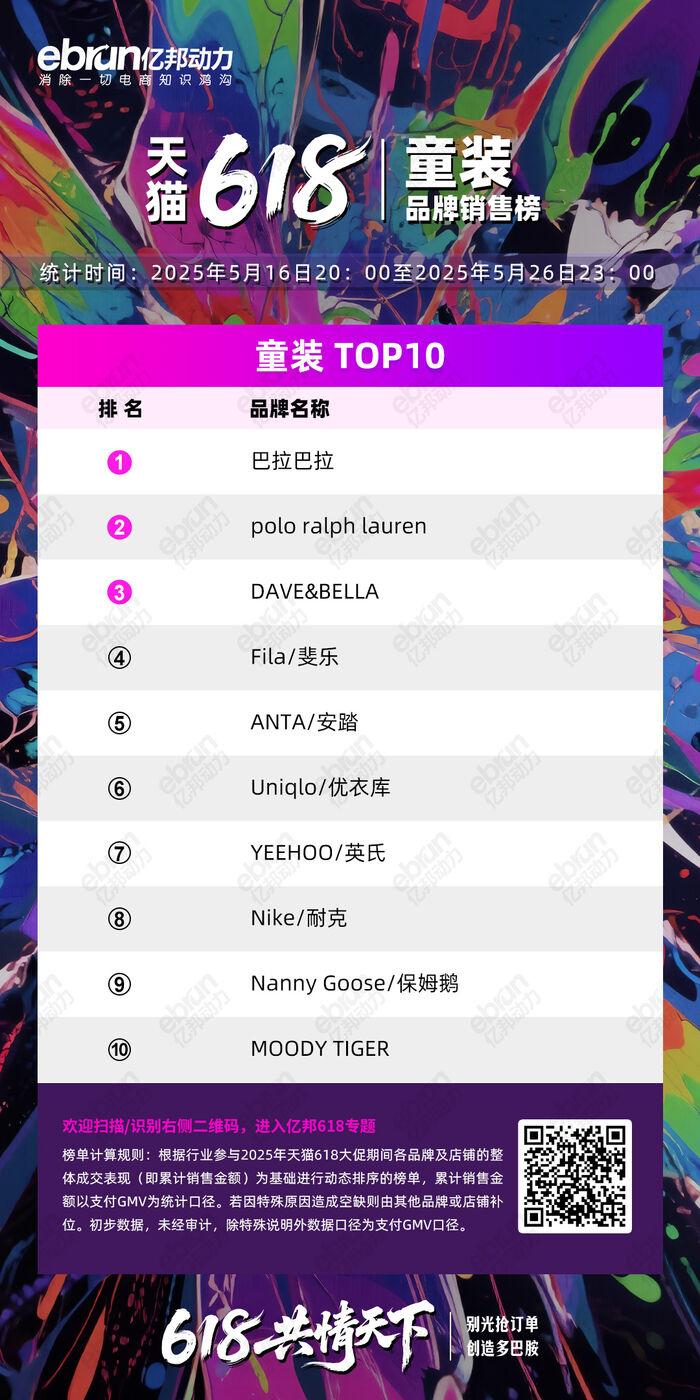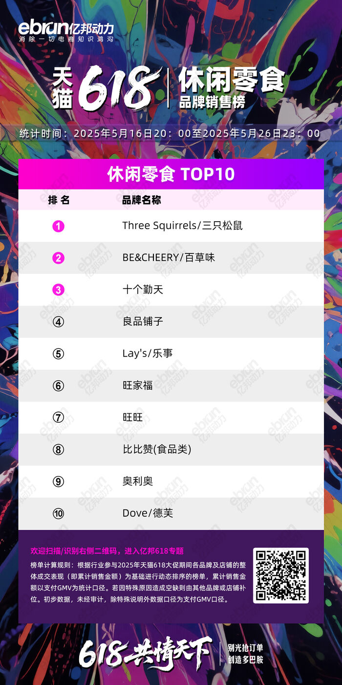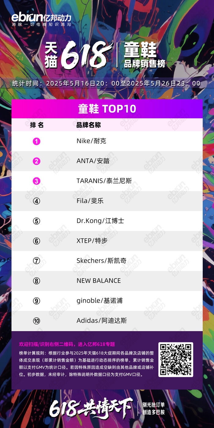 根据行业参与2025年天猫618大促期间各品牌及店铺的整体成交表现(即累计销售金额)为基础进行动态排序的榜单,累计销售金额以支付GMV为统计口径。若因特殊原因造成空缺则由其他品牌或店铺补位。初步数据,未经审计,除特殊说明外数据口径为支付GMV口径。